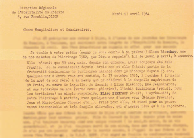 <p>I entrust to your prayer (as I entrust you to her prayer!) Elise Bisschop, one of our patients of the 1962 Pilgrimage.