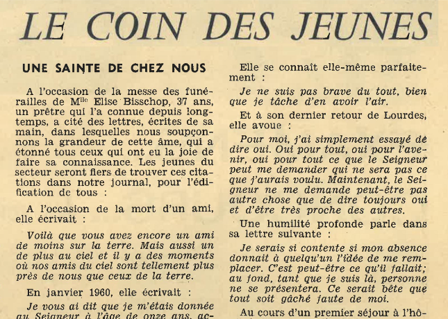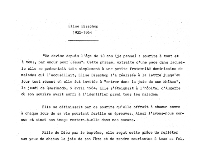 “On the occasion of the funeral mass for Miss Élise Bisschop, 38, a priest who had known her for a long time quoted letters written by her.”