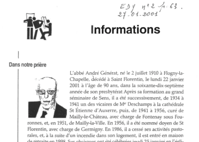 When Father Générat was appointed to Saint-Florentin in 1957, Father Pierre Van Ede from Châtel-Censoir came to help the parish in difficulty.